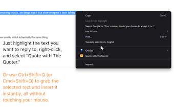 المقتبس هو ملحق مجاني لمتصفح كروم مصمم لتعزيز تجربة الرد على البريد الإلكتروني من خلال السماح للمستخدمين باقتباس نصوص محددة داخل الرسائل الإلكترونية بسهولة. هذه الأداة تبسط عملية الرد على نقاط معينة من خلال إنشاء كتلة رد نظيفة ومنسقة للنص المحدد. مع نقرة واحدة أو اختصار لوحة المفاتيح، يمكن للمستخدمين إدراج الاقتباسات مباشرة في مؤلف البريد الإلكتروني الخاص بهم، مما يجعل ردودهم أكثر احترافية ووضوحًا، بينما يوفر أيضًا الوقت في التنسيق وإدارة النصوص.